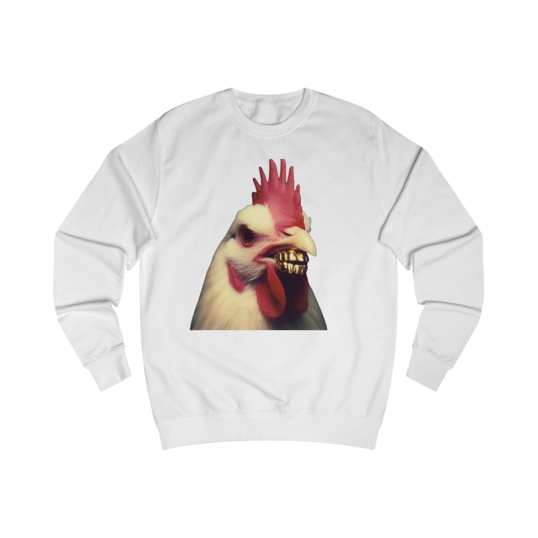 This medium-heavy sweatshirt carries a bold, uncanny rooster portrait front-and-center — a little wild, a little darkly humorous. The image sits in a soft triangular frame on a clean white fabric, so the art reads like a statement piece without shouting. Slip it on when you want an offbeat conversation starter that still feels lived-in: the ribbed collar and side seams keep the shape while the tear-away label removes irritation. It wears like a familiar favorite, with enough weight to hold the print and enough softness to layer through cool mornings and late-night hangs.
