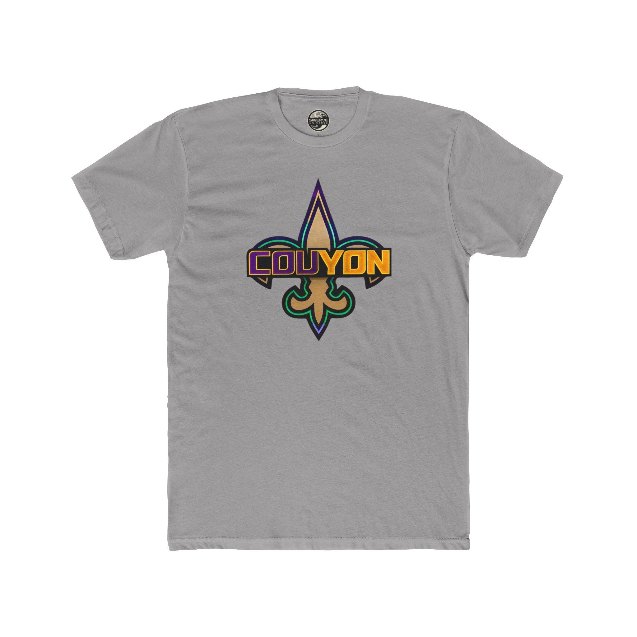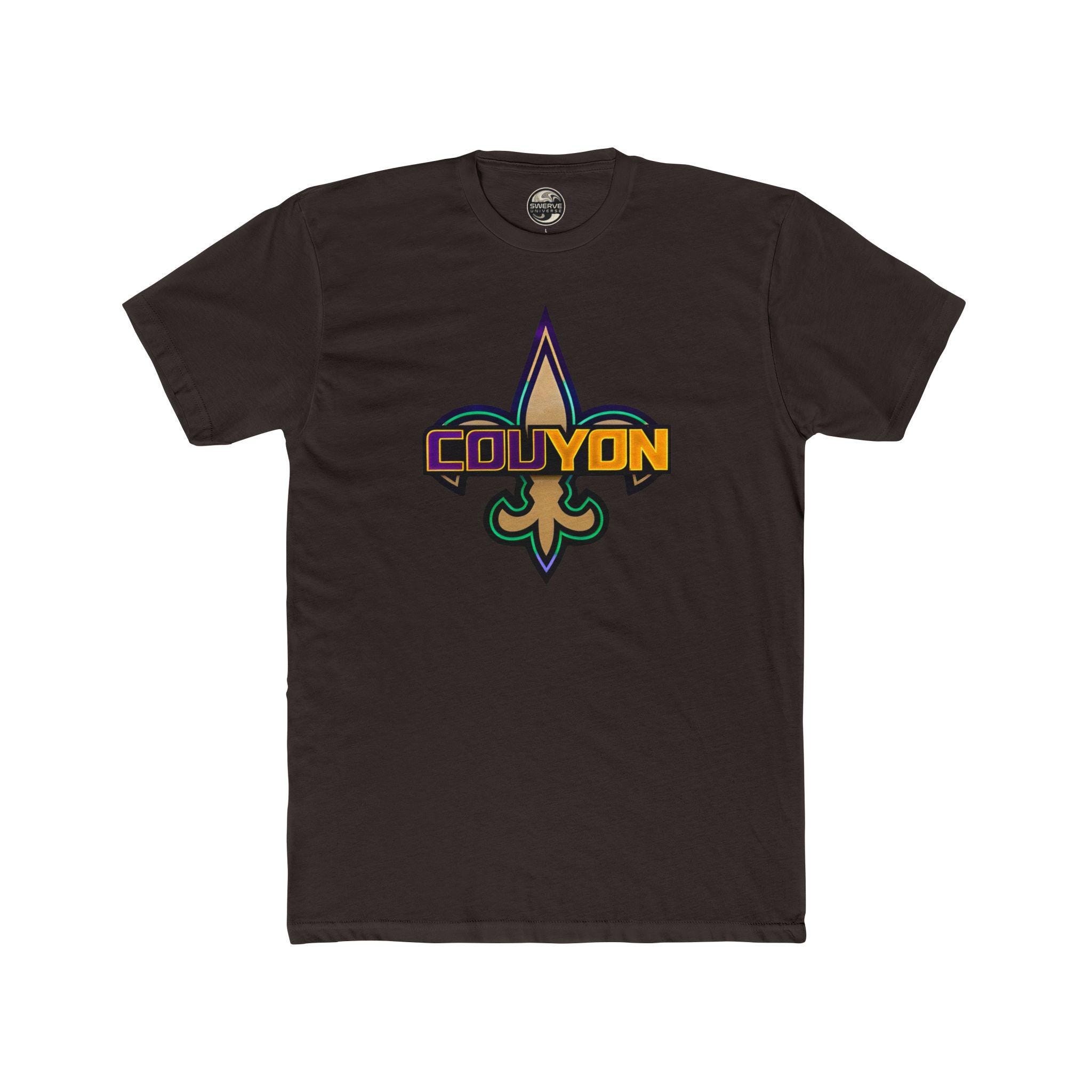 The COUYON V.2 lightweight cotton crew tee that carries streetwise energy and subtle athletic flair. The front features a bold emblem combining a fleur‑de‑lis motif with layered color blocking and the wordmark “COUYON” for a retro‑graphic look. The back shows a restrained, gold‑tone “SWERVE UNIVERSE” logo across the shoulders, keeping the overall design balanced and wearable. Soft, breathable fabric and a classic crew silhouette make it easy to layer under a jacket or wear solo on warm days. The tee wears like a familiar favorite — broken‑in comfort with a statement graphic that nods to urban sports culture and late‑night drives.