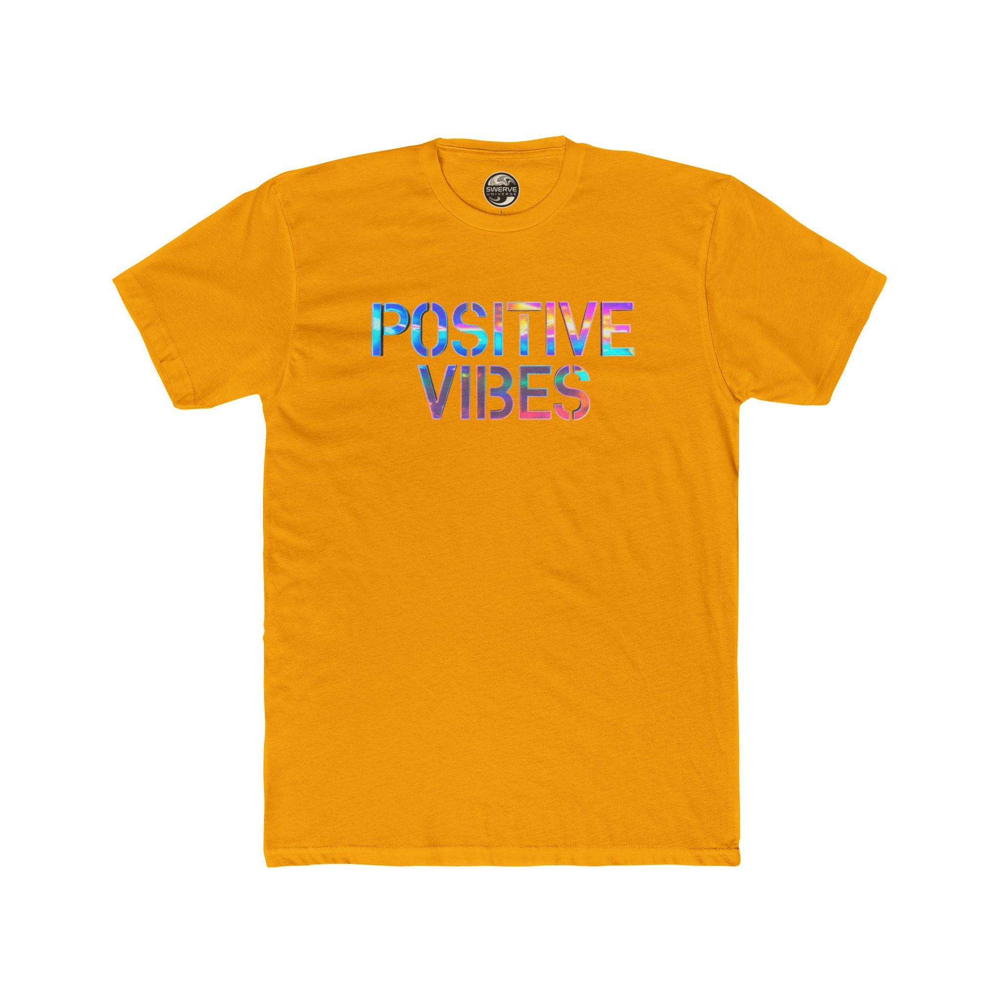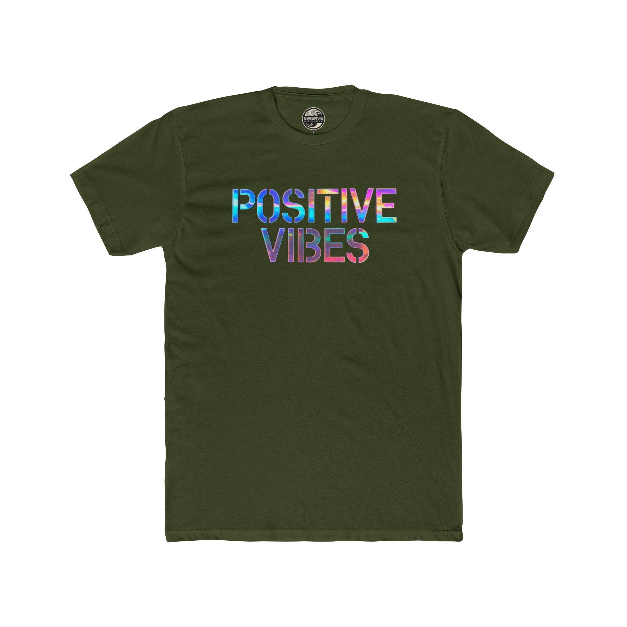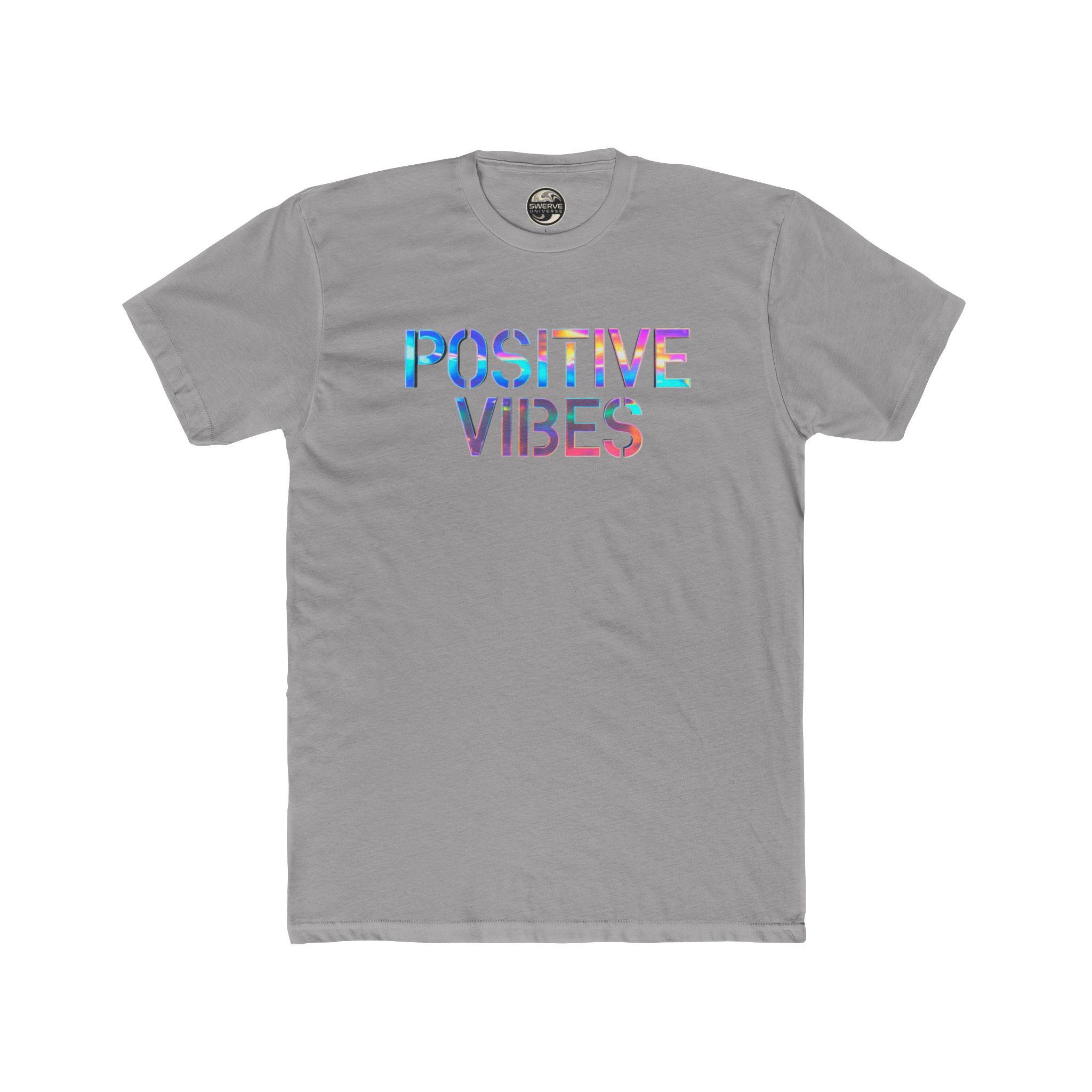 Lightweight and breathable, this cotton crew tee carries a calm, sunlit energy. A colorful "POSITIVE VIBES" print on the chest catches the eye with watercolor-like hues, while a retro-inspired swirl logo sits centered on the back for a subtle, confident finish. Wear it on slow mornings, skate sessions, or nights out with friends — it layers under a flannel or stands on its own with jeans. The fit is classic and comfortable, with a ribbed collar and shoulder tape that keep the silhouette neat even after repeated wear. It feels easy, familiar, and quietly optimistic: the kind of tee you reach for when you want to bring a little color and good energy into the day.
